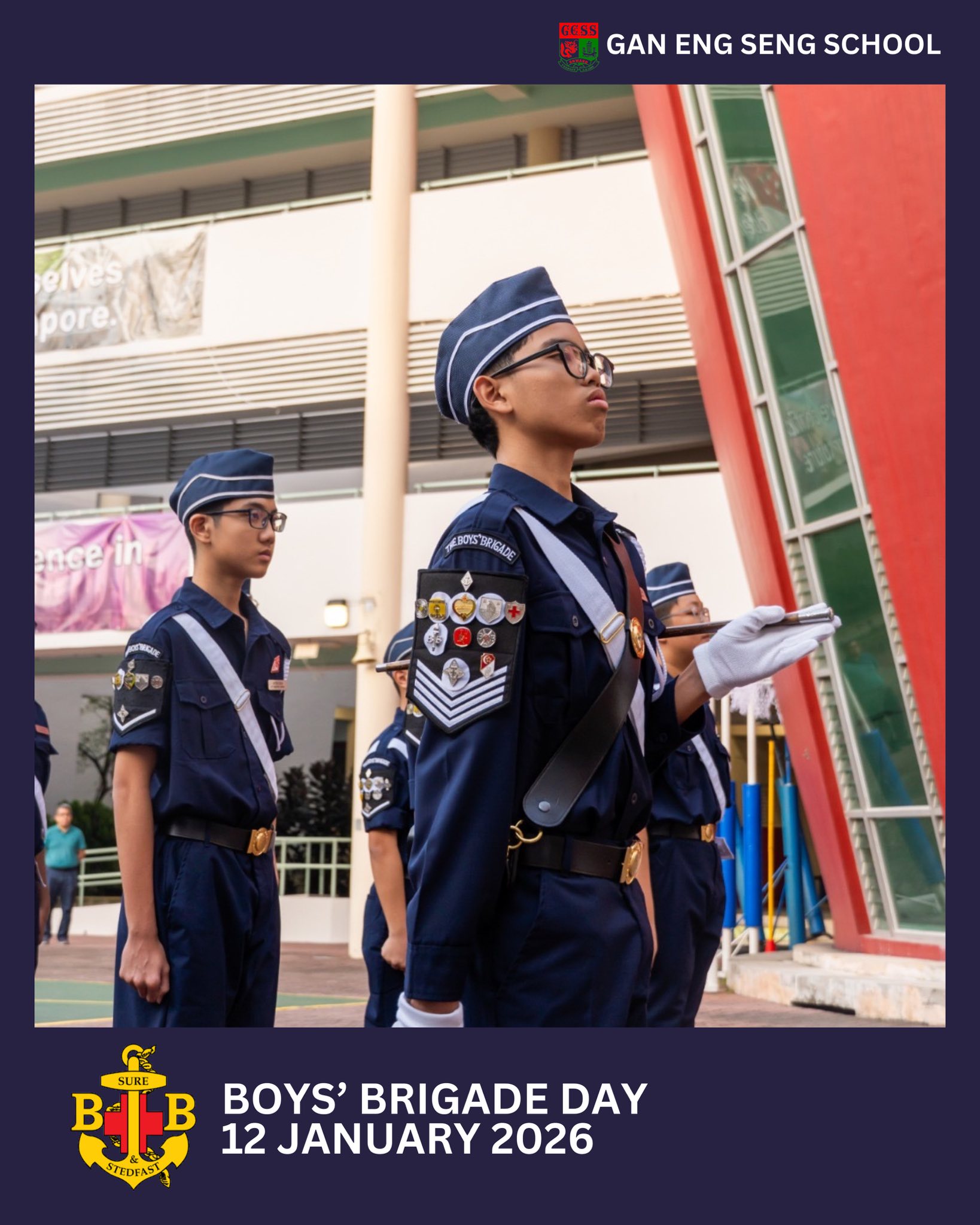 The 50th Company commemorated the Boys’ Brigade Day in the Arena of Gan Eng Seng School on 12 Jan 2026. A full parade was conducted with the trooping of the company flag and a march-past with the inspection of our principal. DY-CSM SSG Jonas served as the parade commander, SSG Ashton led the contingent and the flag party consists of SSG Rayden, SSG Jaden and LCP Julian. The 50th Company will continue to prepare all boys for the future through a fun and holistic curriculum, which allows boys to foster meaningful friendship and to be groomed to be leaders.